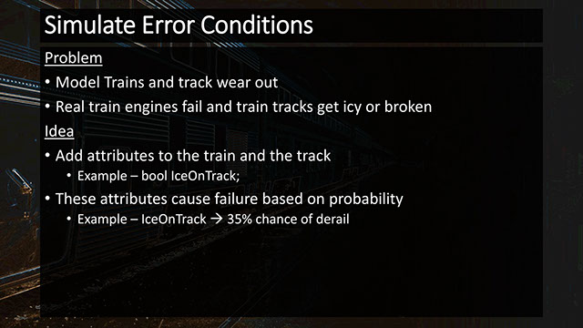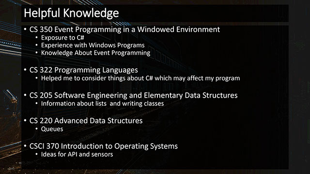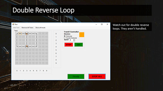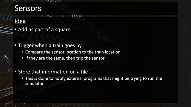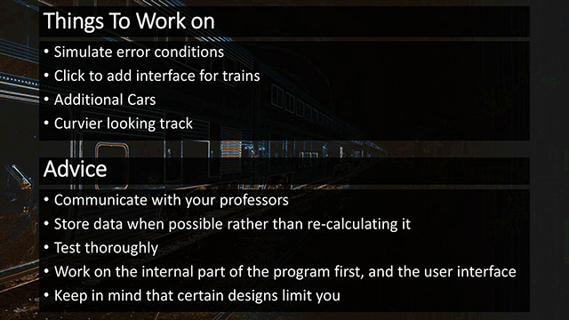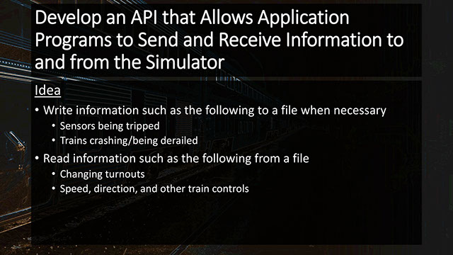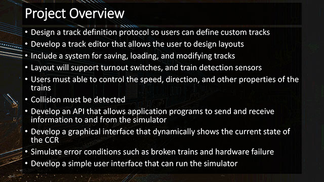 The Computer Controlled Railroad (CCR) is an HO scale model railroad that is controlled by a PC using robotic techniques. It is currently used in computer science classes like Operating Systems and Machine Organization to help students visualize concepts like multi-tasking, racing conditions and interrupt processing. Several student projects have used the CCR to learn about robotics, client-server processing and real-time processing. Unfortunately, there are only two physical railroad layouts for students to test their designs and algorithms. Development is also slowed by issues like trains derailing, damaged track and power loss. A CCR simulator would allow several students to be working on the railroad at the same time and whenever and wherever they want. Project Description: Develop an application that simulates a CCR allowing applications to plug into the actual CCR without major modifications.