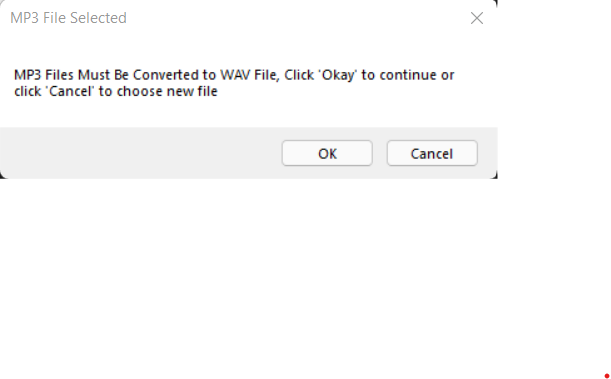Unfortunately though, this came with some errors of its own. AudioFileReader would throw an exception when trying to play an mp3 which was not ideal as mp3 is the most common and popular audio file format. So, I did some more digging online to see if there was any way that I could work around this. There were a few sites that talked about writing the contents of the mp3 file to a memory stream and then reading it from there, but all of those used MP3FileReader which also did not want to work with any of the mp3 files I tried. I eventually decided to just have the user “convert” the mp3 into a wav file by prompting them (I’ll include a screenshot below of what the MessageBox says). This wasn’t my ideal solution, but it will have to suffice.