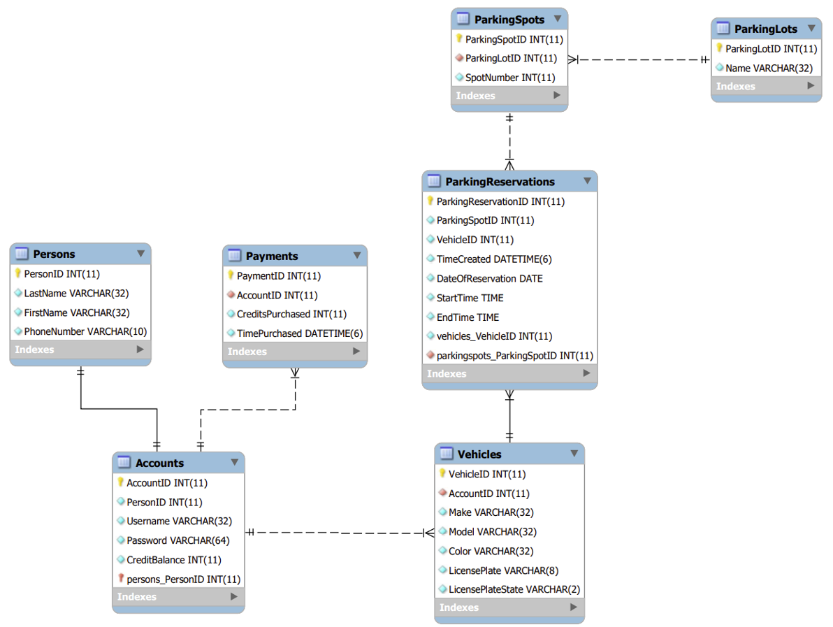 What the code in each folder does - "Controllers": Each class contains methods which handle a specific API request. The class name is added to the base url ("http://compsci04.snc.edu:3910/api/") of the api. For example, if I were to want to make a GET request to the ParkingSpots class, the url will be "http://compsci04.snc.edu:3910/api/ParkingSpots". "DAL": The class in this folder contains the connection to the database by creating a context with Entity Framework. "Models": The objects which correspond to an entity in the database.