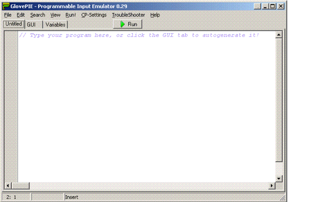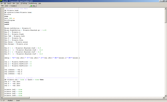 GlovePIE = the program which allows us to interact with a Bluetooth connection and the Nintendo WiiMote. This picture is a screen shot of the main user interface.