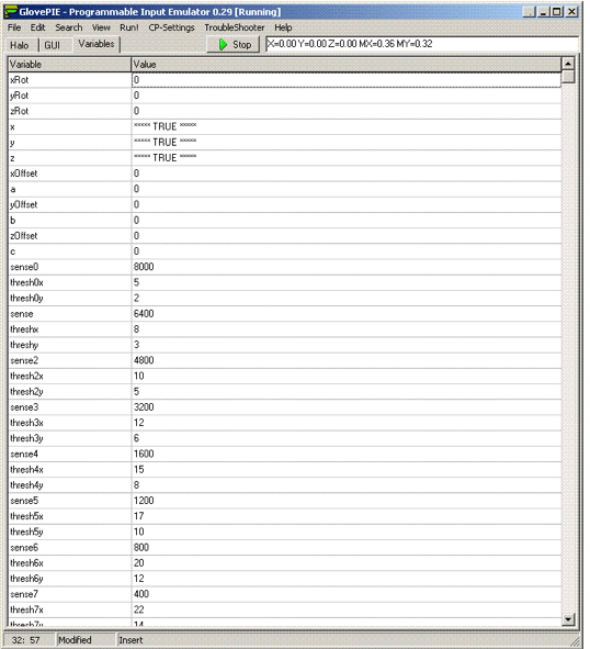 In this screen shot you can how GlovePIE tracts the variables used in our code. This screen is the only type of debugging software available for users to correct errors in code.