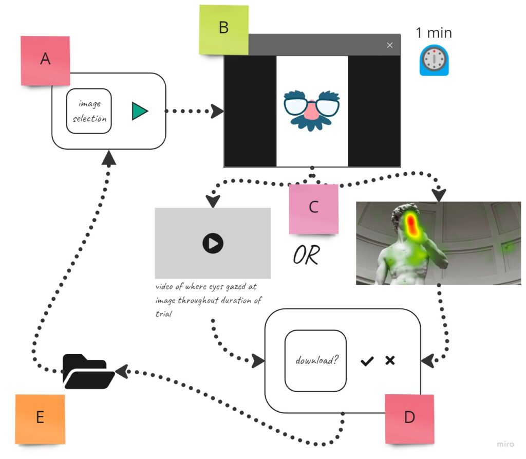 After selection, the start menu disappears from view and the trial begins. The user looks at the image for a minute while the application tracks the user’s eye movements on the image.