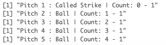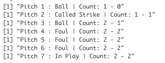 Getting back into my project after Spring Break, I was able to complete a full at-bat simulation in R! I was able to add the count into the simulation's logic in deciding whether a batter would swing at a pitch and the result of the contact made. This not only gave me a more accurate model, but is a crucial variable when users are running their own simulations on my dashboard. In R, I