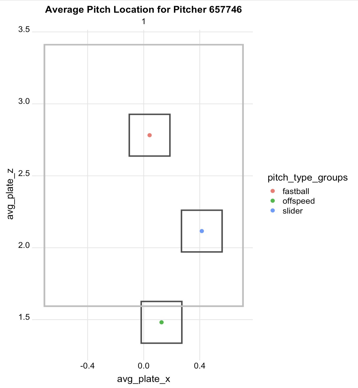 After finding the proportions of pitches thrown outside the zone and the results of those pitches, I moved into analzying specific pitchers and their pitch locations with results. I decided after our weekly meeting that I would start by selecting a pitcher and finding the average x and y coordinates of his pitches thrown, broken up by the type of pitch. With the average locations, I created a box (approximately equal to the radius of a baseball in each direction) around each coordinate. With each box around the average coordinates, I filtered my dataset to pitches inside any of the boxes. Then, I found the proportion of pitches in each box that were called strikes, fouls, swings and misses, hits, etc. With this information, I can compare the expected results of throwing a pitch in their average area versus somewhere else in the strike zone. Ideally, I would like the user to pick a scalar for the x and z coordinate of the average pitch location to see how the zones differ. This week I want to generalize this process to set myself up for users to be able to pick a pitcher and scale for the pitch coordinate. I think it would also be interesting to look at the optimal location/zone for each type of pitch for a specific pitcher.