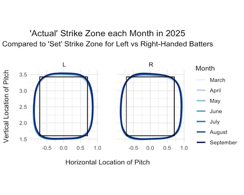 zone throughout the 2025 season for both left and right-handed batters. I also looked into comparing the 2024 season, when balls and strikes could not be