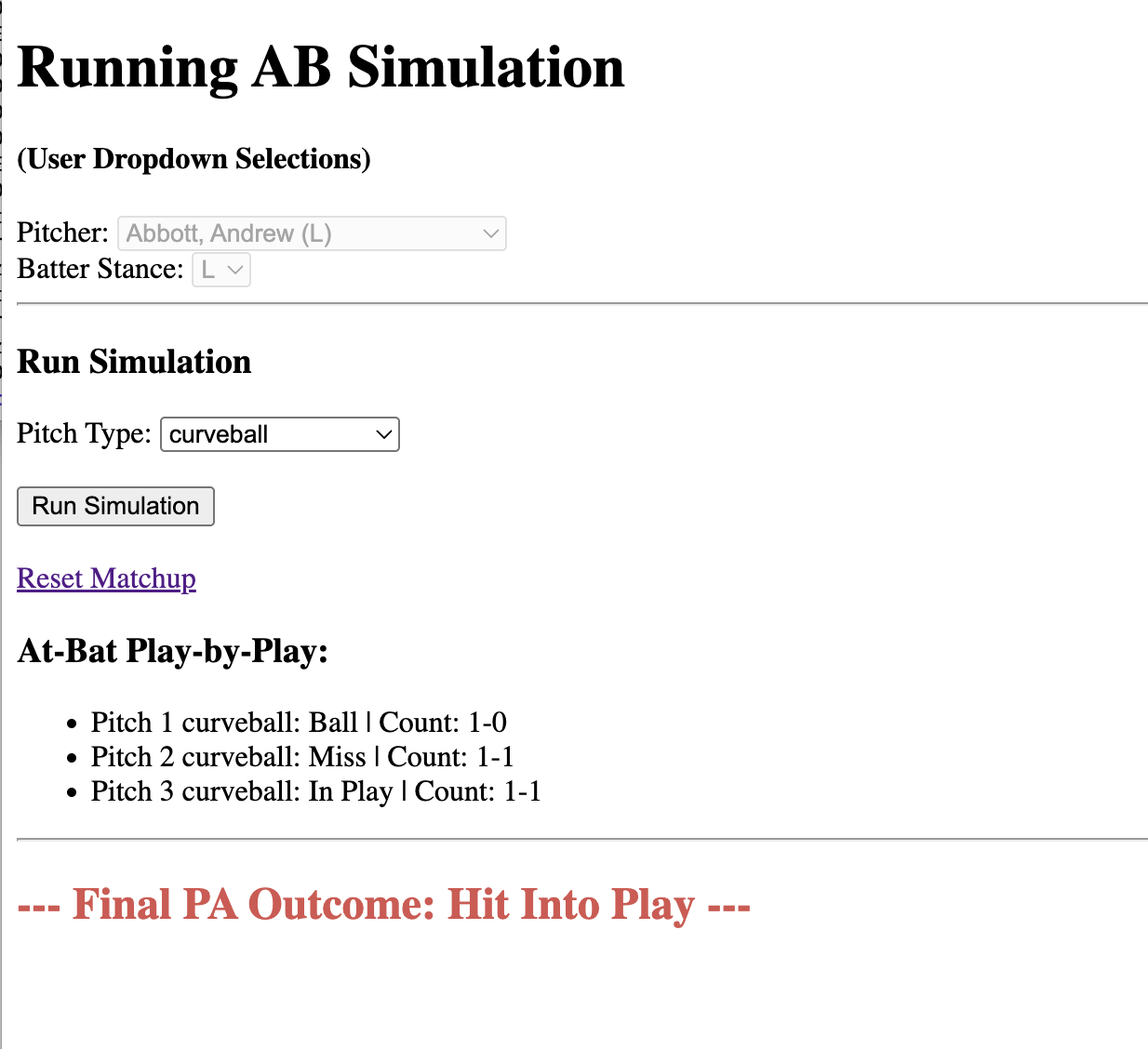 tested running a full at-bat with a selected pitcher, pitch, and batter stance to test the code's logic and the results this would give me. In my dashboard, the user will be picking a different pitch and location each time, but for the sake of this test, it used the same selection until the at-bat was over. This worked so well and I definitely saw my results vary as I changed the location and