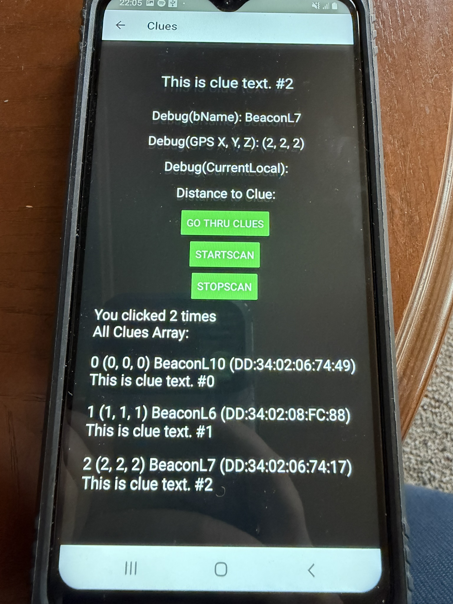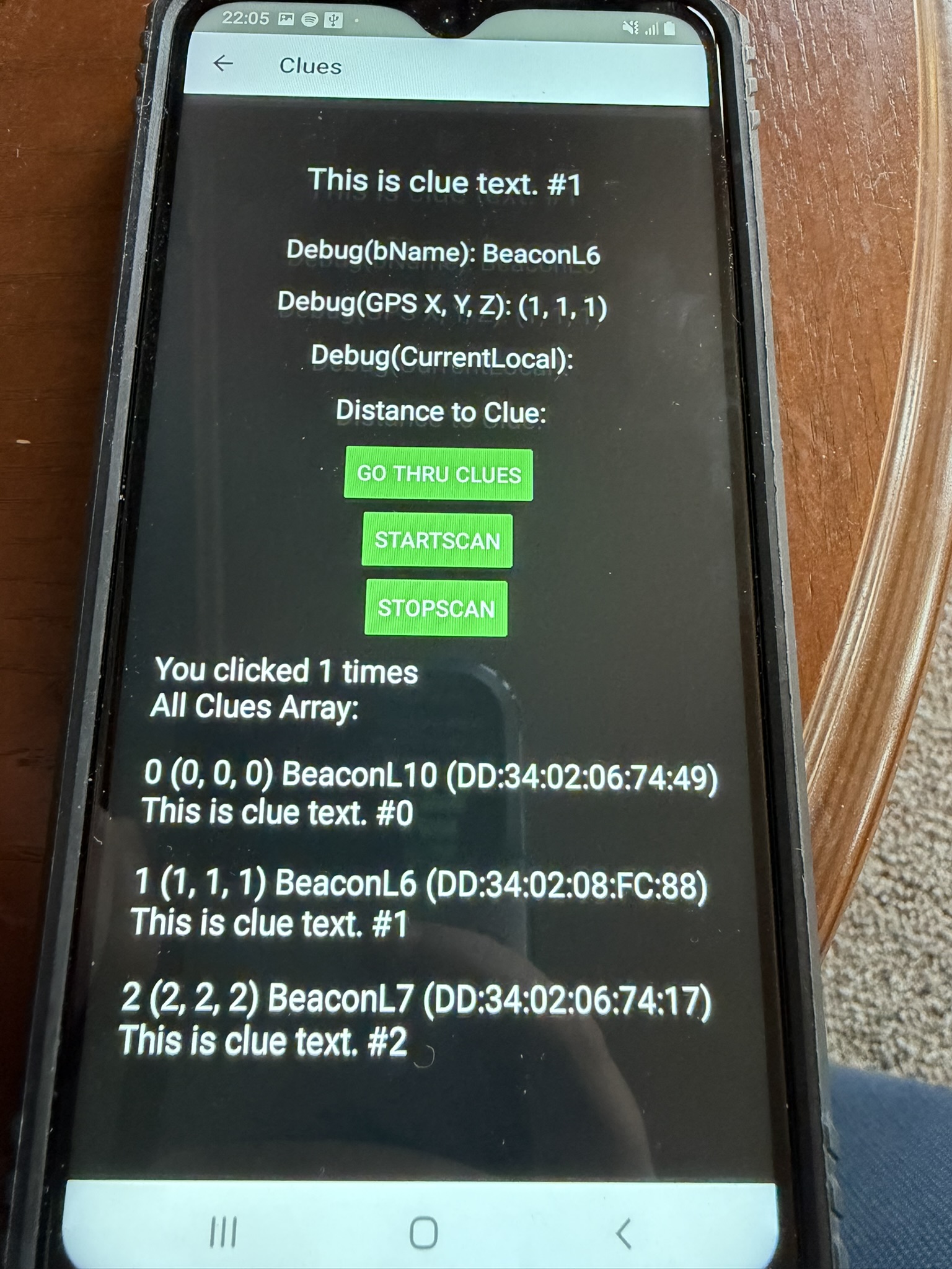 Clue page had a placeholder for where the clue text would go and three debug placeholders for me as I test. The three debug texts will be the Beacon ID/Name, the registered GPS coordinates of the Beacon,