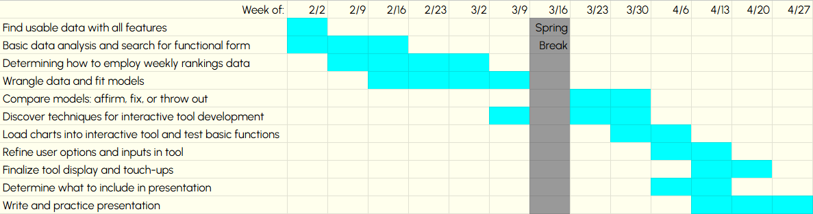 The goal of this project is to create a model that uses an ATP tennis player's ranking history, among other factors, to predict their future ranking. Predictions will be made by comparing current players to ranking trends of the past. Additionally, a tool will be developed allowing users to view predictions for a chosen player, as well as compare historical and projected rankings.