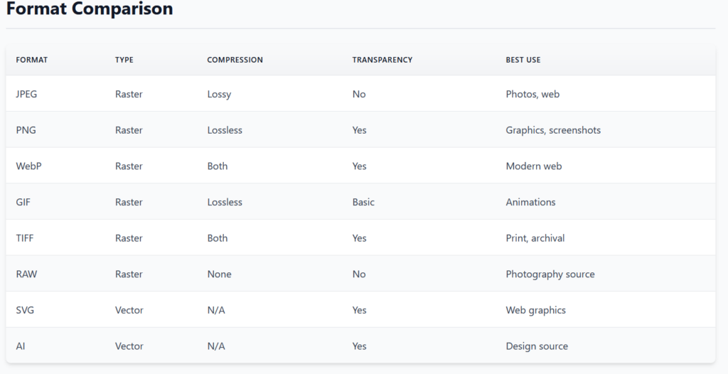 “Types of Image File Formats: Complete Overview.” BulkImagePro, BulkImagePro, 17 Feb. 2025, bulkimagepro.com/articles/types-of-image-file-formats/.
