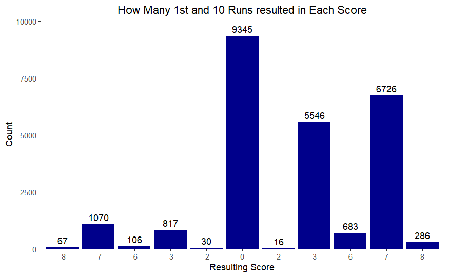 The graph shown below is taking all of the 1st and 10 runs and seeing how many points came from the resulting drive. The most frequent result is that the team’s drive stalls out and they don’t score. It is surprisingly unlikely that the result of the drive is a turnover that has the opponent score.