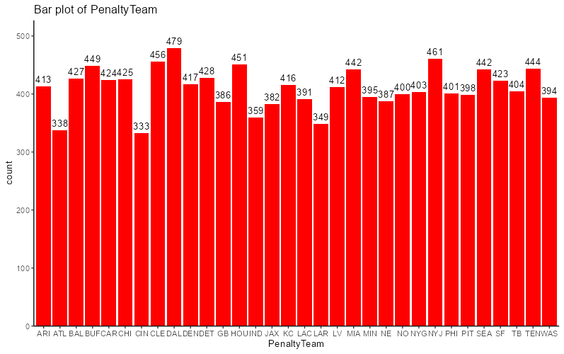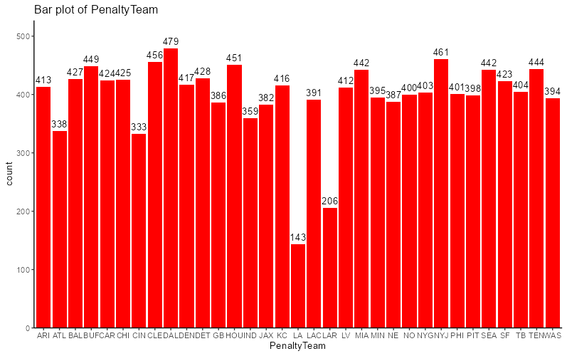 From first glance, this looks like two teams have substantially less penalties called against them than the rest of the league. This type of bias would certainly get called out within a 4 year timeframe, so why is it going unnoticed? Well, it is a lot simpler than that: looking closer into what two teams are receiving fewer penalties, they are the LA Rams and… LA…? Turns out there was some inconsistency with recording the information. Looking closer into this, between the years of 2022 and 2023, the data switches over between the two. Those two bars each account for two years of penalties, and are being compared with the other teams penalties across four years. After fixing up this inconsistency, the result looks a lot better, the LA Rams are still one of the least penalized teams, but it doesn’t look like an outlier.