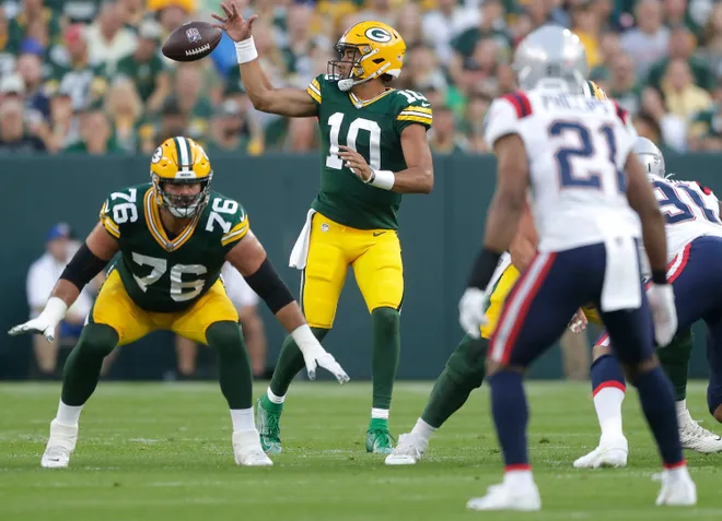 Picture from PackersWire. Article titled “What happened on botched snap between Josh Myers and Jordan Love vs. Patriots?”