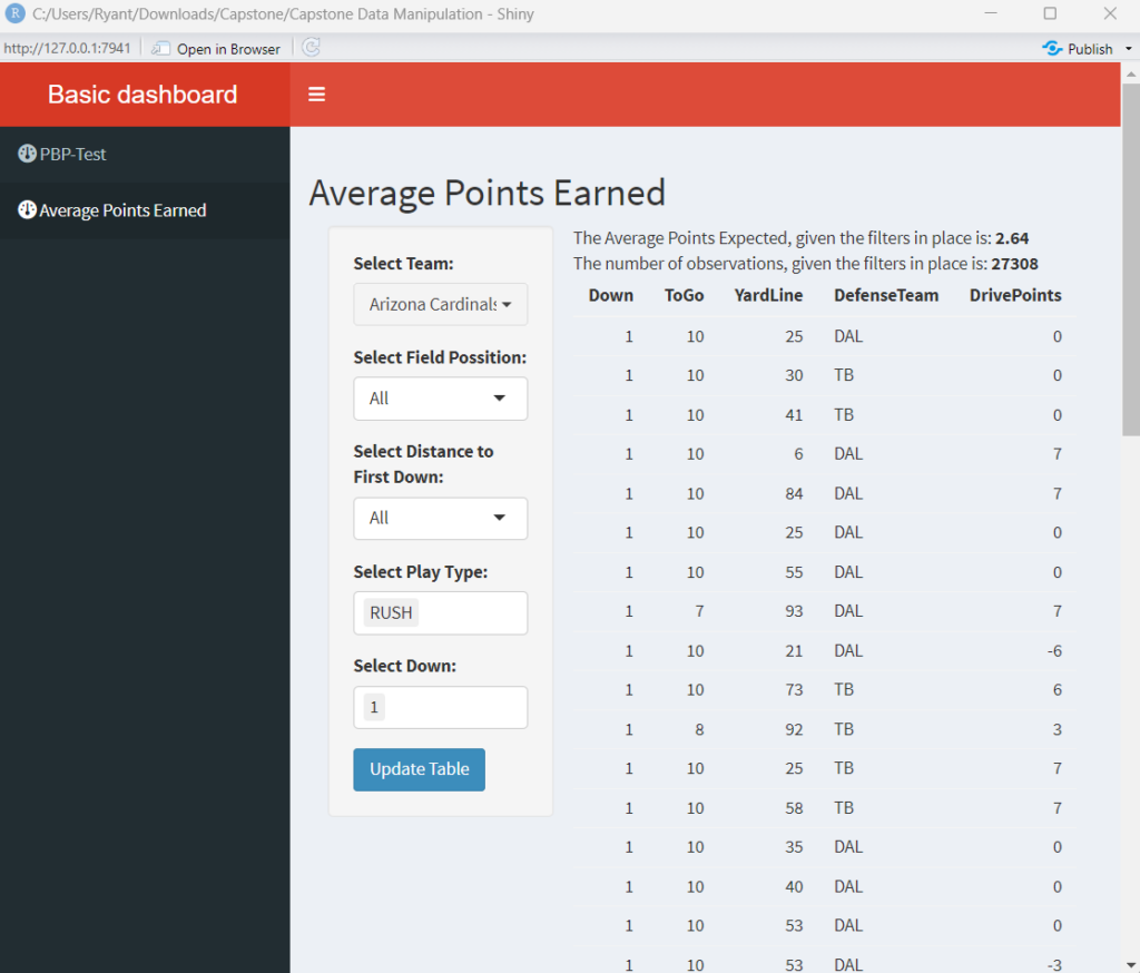 With the table, I also added some text that does the calculation for the Expected Points Added given the filters in place. At the same time as the table is told to update, the text is told to update, and part of that includes a calculation of the value, and then lists a count of how many datapoints are part of the calculation. By the end of all of the changes, it looks something line this: